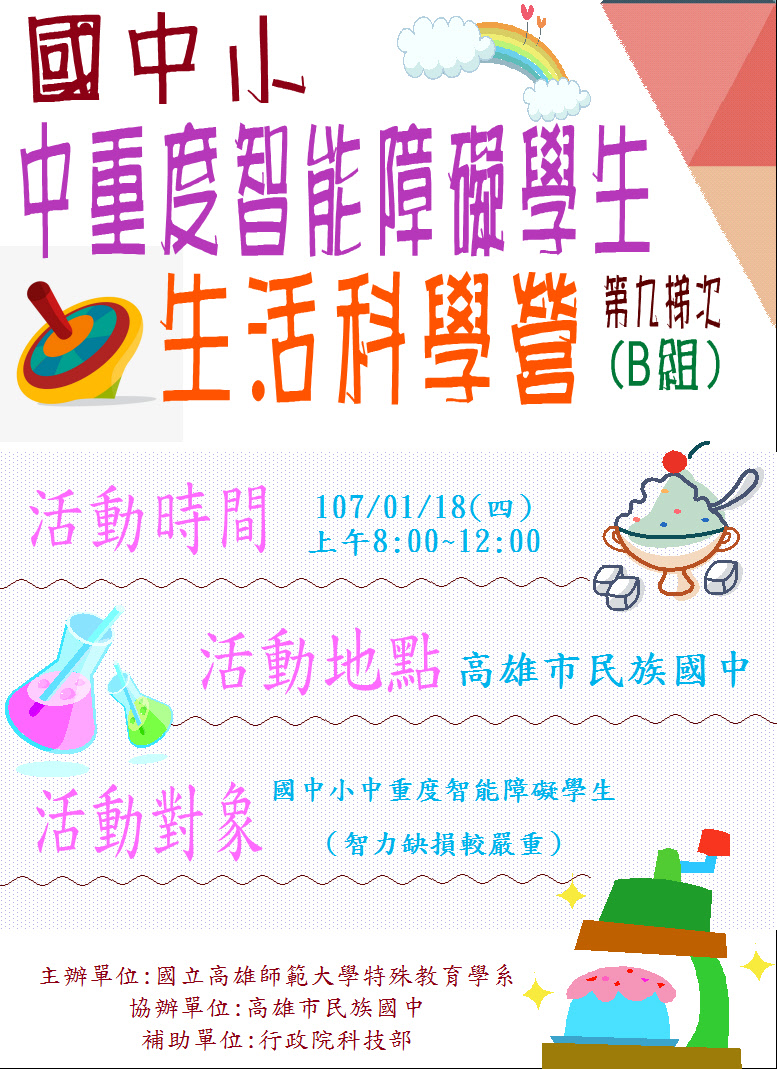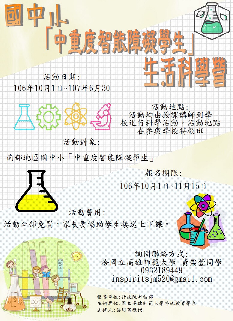 一、 目的:為了提升國中小中重度智能障礙學生喜愛科學、參與科普活動之興趣,由行政院科技部補助國立高雄師範大學特殊教育學系辦理此營隊,將科學與遊戲結合,期許學生對相關科學概念有初步認識,並願意動手解決實際問題,從中體會科學探索及發揮問題解決能力。