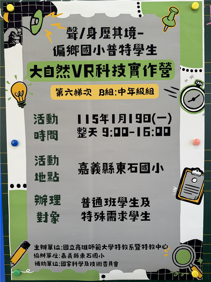 (二) 第五梯次(B組教室:中年級學生):1115年1月19日(星期一整天)9:00-16:00,嘉義縣立東石國民小學。