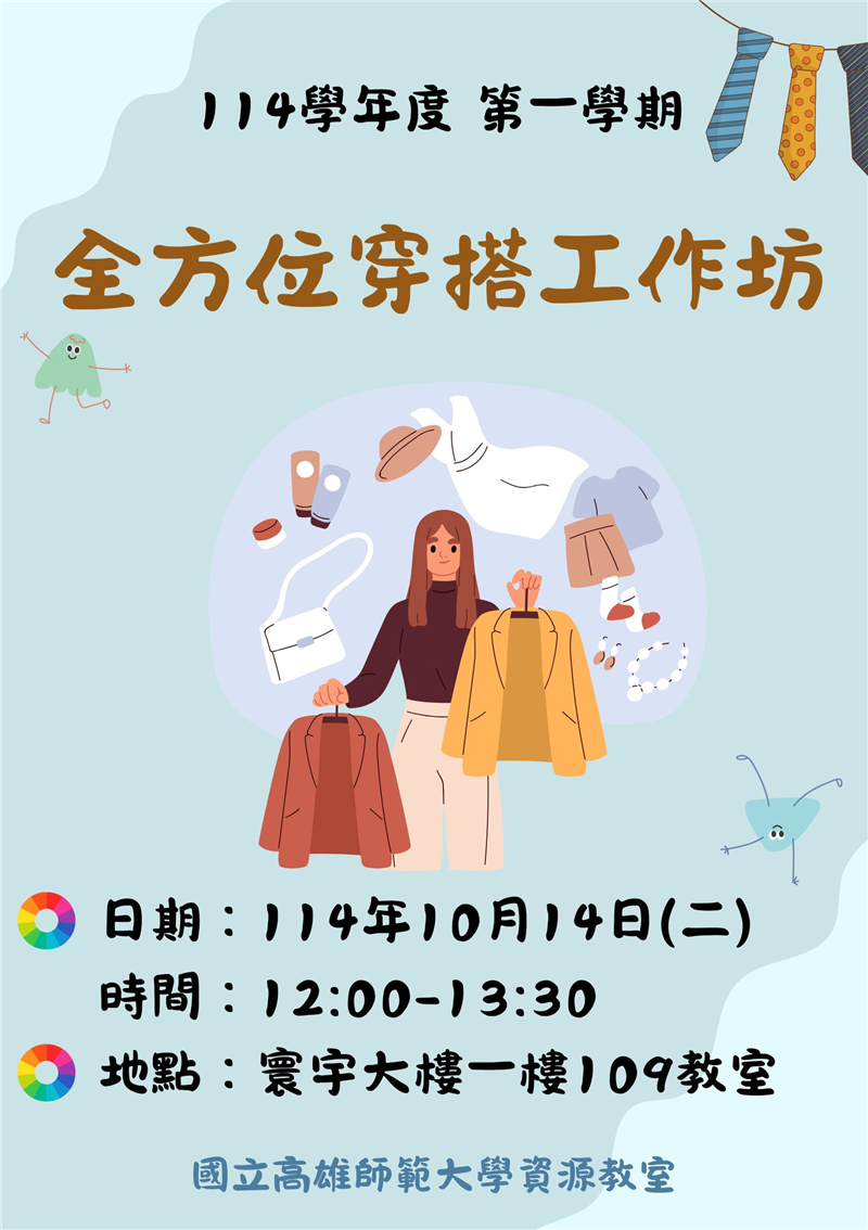 為協助學生培養服裝搭配的概念及技巧,資源教室安排全方位穿搭工作坊,特邀樹德科技大學流行設計系洪慕藍老師擔任講師。課程內容以認識適合自己的衣服風格為主軸,透過講解四季色彩理論,讓學生了解春、夏、秋、冬四種色調的特色與應用,進而延伸至日常穿搭技巧與職場正式衣著搭配重點。