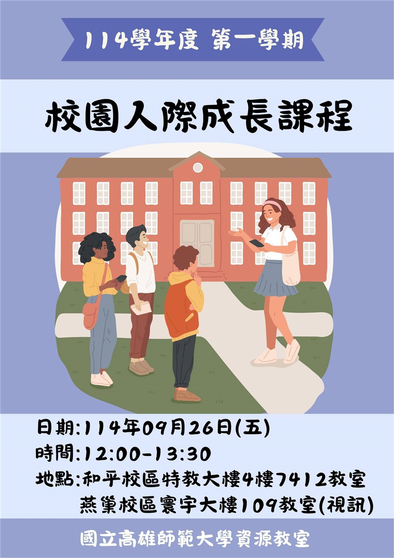 邀請在諮商所執業的諮商心理師進行校園人際成長課程,此次課程在和平校區實體進行,燕巢校區亦以視訊的方式共同連線參與。心理師先了解同學在人際互動中遇到的困難,並透過撥放高師大特教中心編製的校園社會互動技巧影片,帶同學討論哪些元素會構成好的互動,也帶同學去認識及理解在互動過程中可能產生的情緒,以及該如何使用"我訊息"進行態度和緩且訊息內容具體的表達。同學在課程中踴躍發言提問,課後回饋課程內容很有幫助。