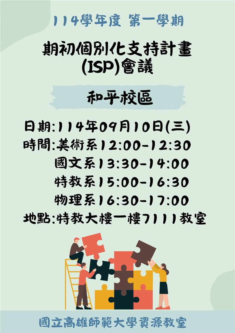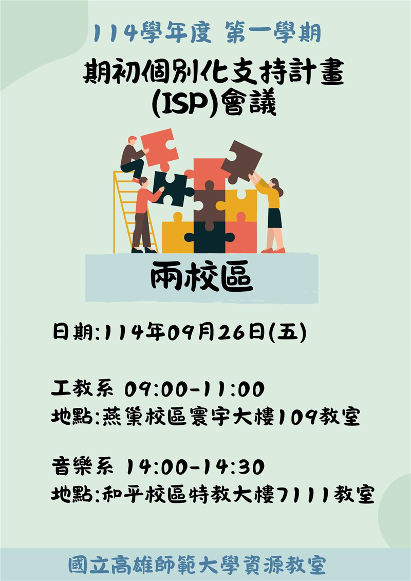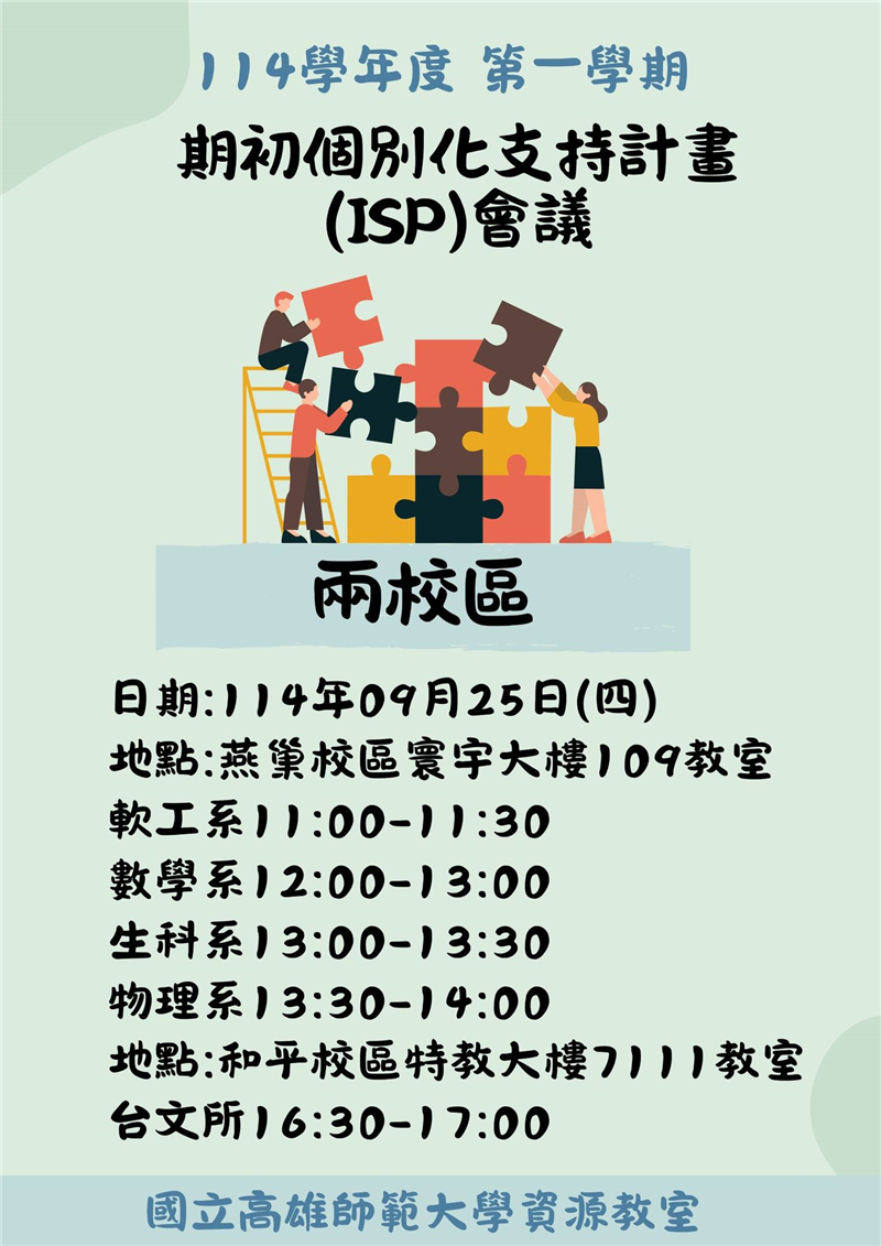早上在燕巢校區召開3場工教系特教學生ISP會議,以及1場工教系新生轉銜會議,在特教中心與系所師長、家長及學生的共同討論下,協助學生在校的學習、生活均能夠獲得所需支持,進而穩定支持學生發展其專才。下午在和平校區召開1場次音樂系學生ISP會議,師長及家長亦依據學生學習弱項,共同提供學伴支持及心理支持,期許學生在新學期的學習越來越得心應手。