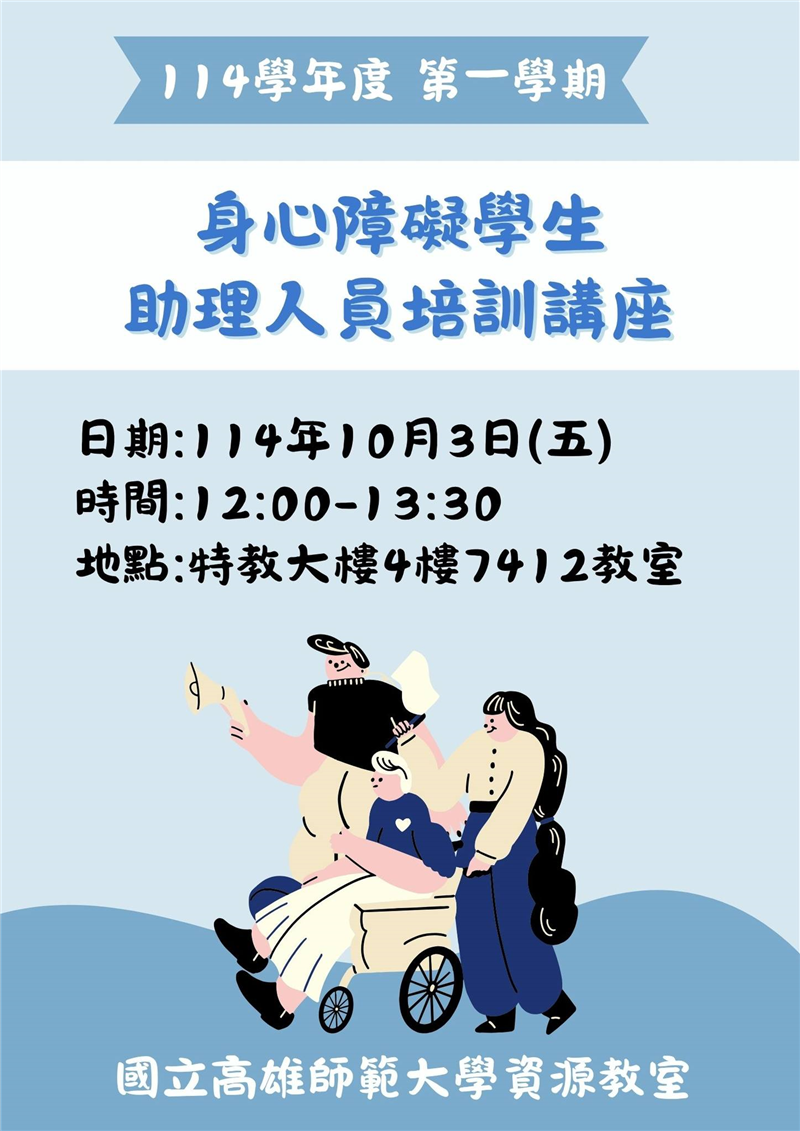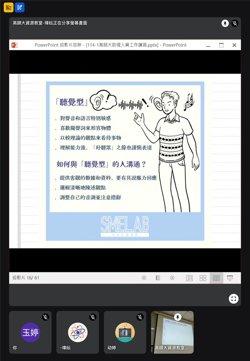 本次活動邀請國立成功大學資源教室輔導員于兆欣老師擔任講師,針對助理人員的工作內容進行分享,包含協助原則、與資教學生的角色定位、各障別的需求介紹,幫助助理人員了解服務對象。活動中加入心理測驗,讓助理人員認識自我人格特質,探索適合的溝通方式,也介紹高師大特教中心的影音資源,提供助理人員在遇到困難時的參考管道。最後提醒當遇到困難時要主動與輔導老師聯繫,共同建立良好的支持網絡。