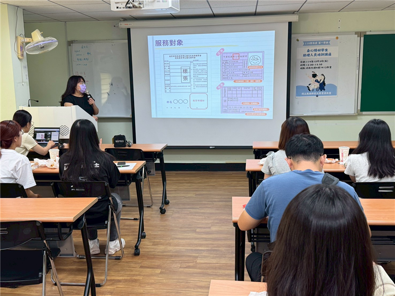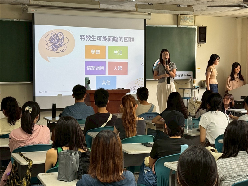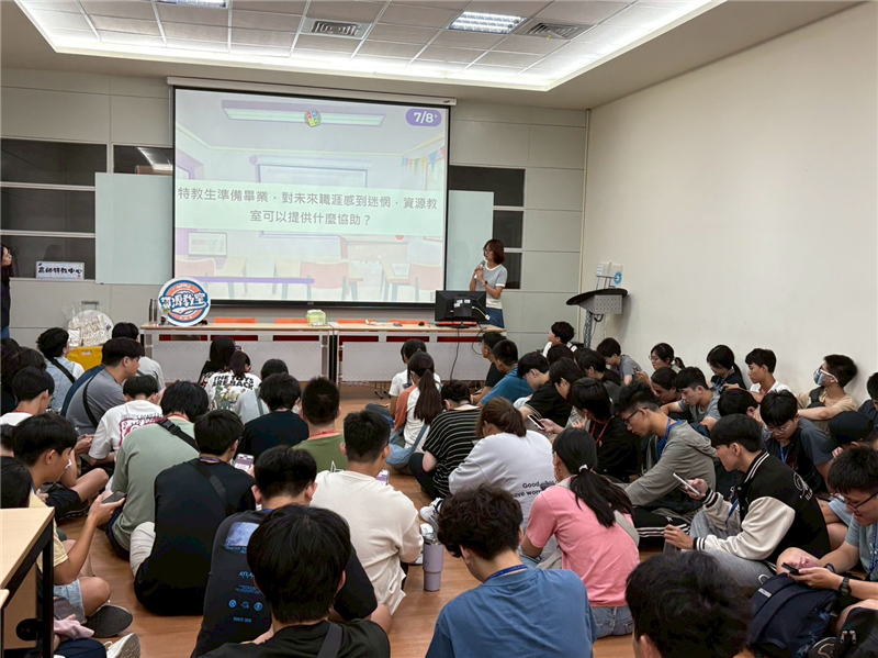 活動中,資源教室輔導員向同學說明特教中心與資源教室的地理位置,主要任務是協助身心障礙學生順利融入校園生活,無論是在課業、生活、職涯發展或心理支持等層面,提供實質的服務與資源。現場也特別分享近兩年獲得總統教育獎的學生故事,讓同學們了解,儘管身心障礙學生在學習與生活中可能面臨挑戰,但只要有適切的支持與自身努力,仍能發揮潛能、創造卓越表現。
