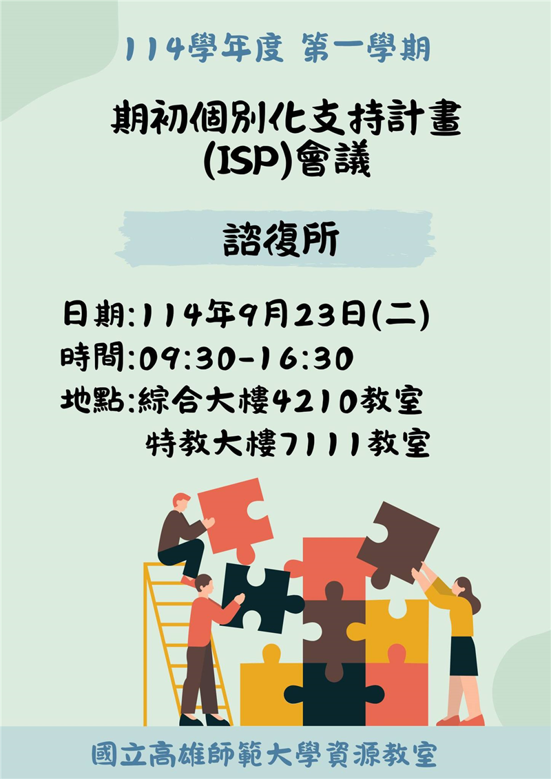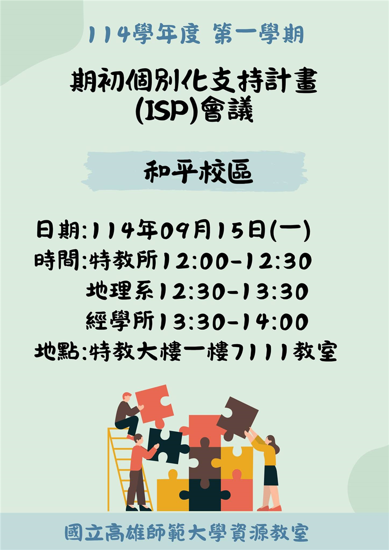 資源教室依法規召開特教所、地理系、經學所共4場特教需求學生期初ISP會議。會中與學生討論新學期的修課規劃,如課堂分組安排、考試調整、教材調整等,並協助寄送任課通知信,讓師長們了解學生需求,提供適切的支持。另外針對職涯發展部分,特教中心蔡明富主任分享公職準備策略與資源,鼓勵學生多加利用。