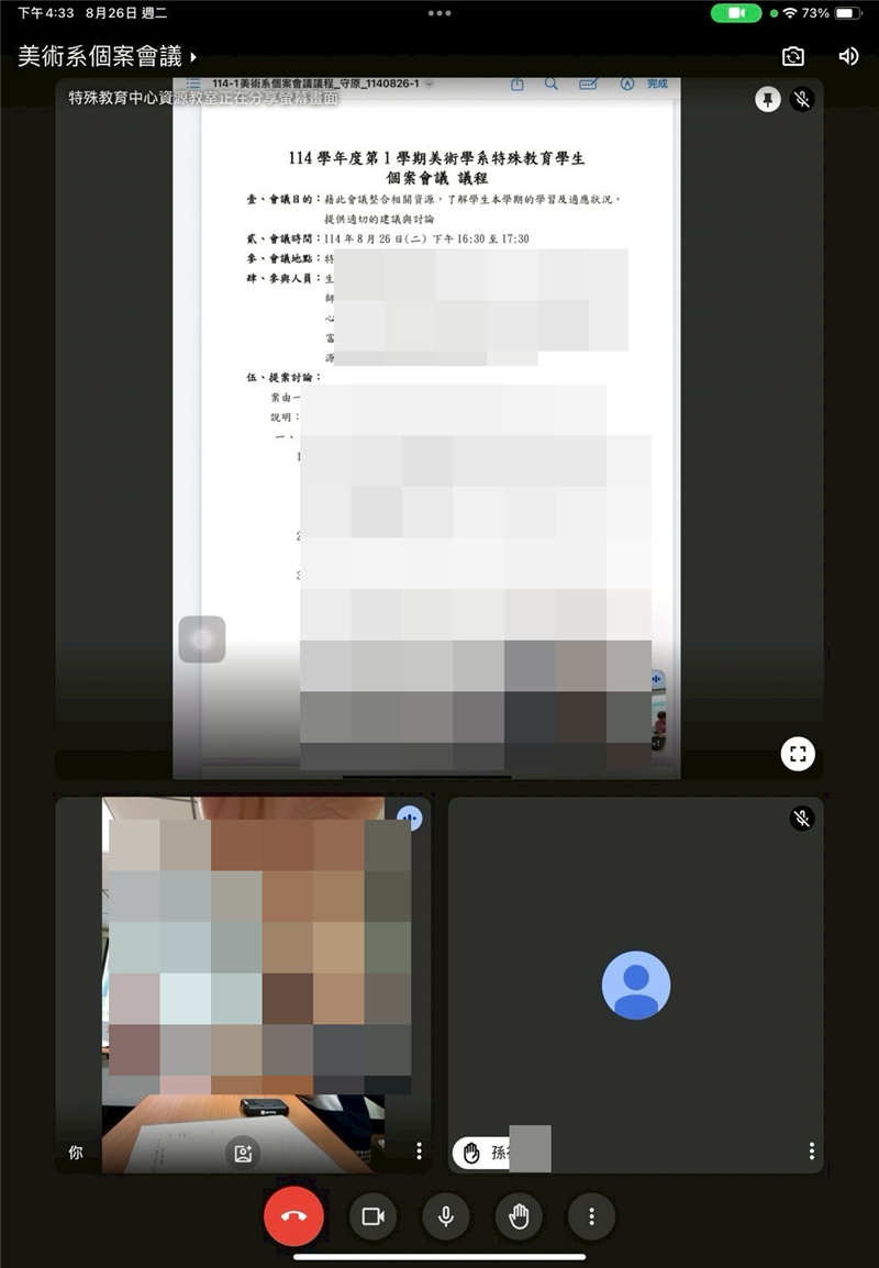 為協助美術學系的特教學生114學年在學校的身心適應及學習支持能在開學前就緒,特教中心蔡主任邀請系主任、導師、任課老師、教務處、生輔組、學輔中心及資源教室輔導員、學生、家長共同與會,決議在全校各單位的正向行為支持分工及學生、家長合力努力下,持續協助學生在校的身心適應,另在學習支持上,系所考量學生的人際限制及美術專才,亦提供畢業門檻的支持調整。