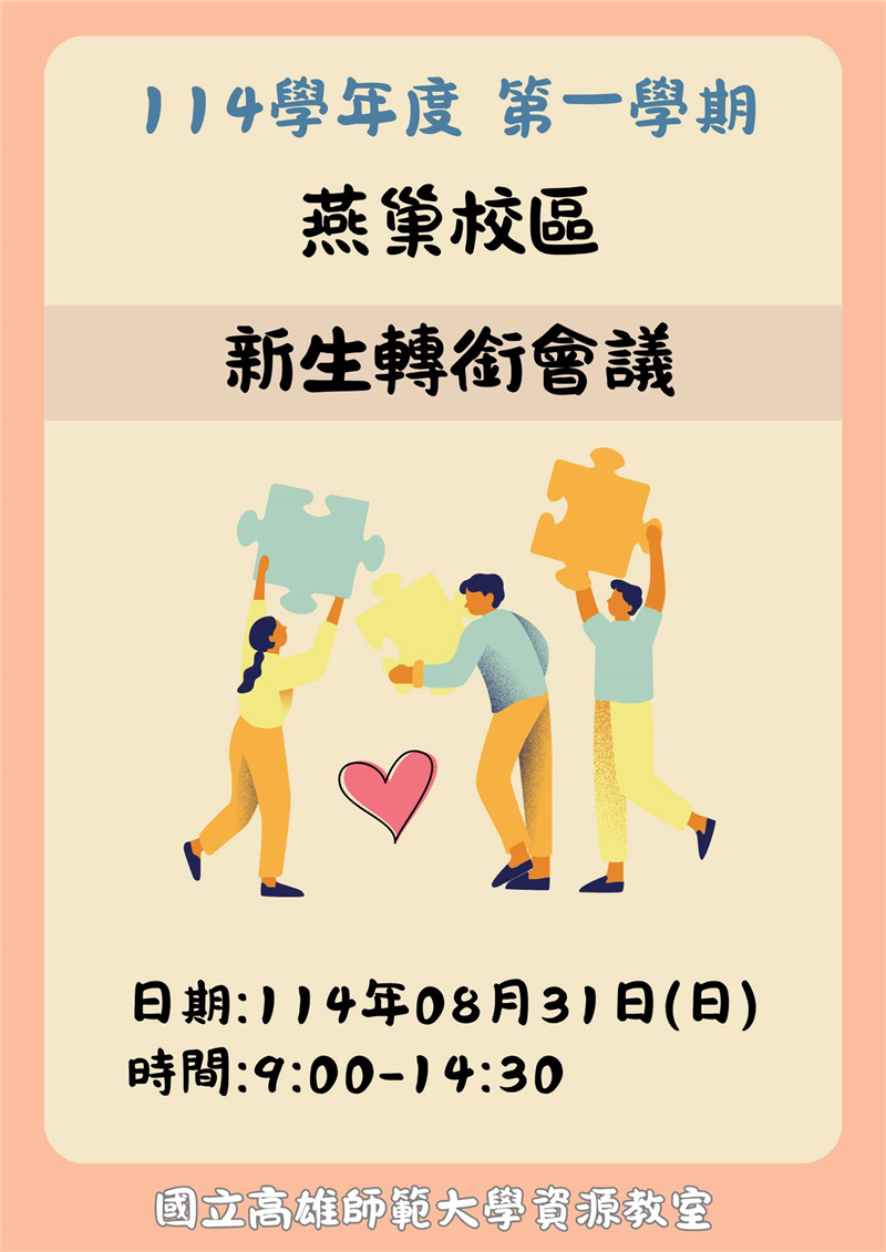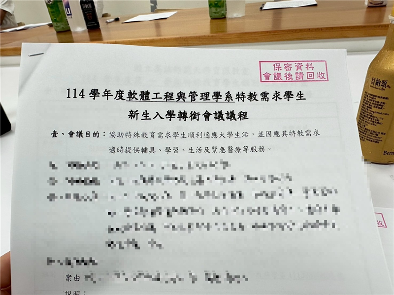 為協助大一新生順利融入大學生活,資源教室於開學前夕前往燕巢校區舉辦新生轉銜會議,由特教中心蔡明富主任親自主持。本次共召開7場次會議,分別至軟工系、電機系、生科系及工設系進行,會議過程中,透過與系所師長、家長及學生的面對面交流與深入討論,全面了解學生過往之學習經驗與適應狀況,並針對課業學習、生活適應及人際互動等層面的支持需求進行初步規劃,以建構更符合個別需求的輔導策略與支持服務。