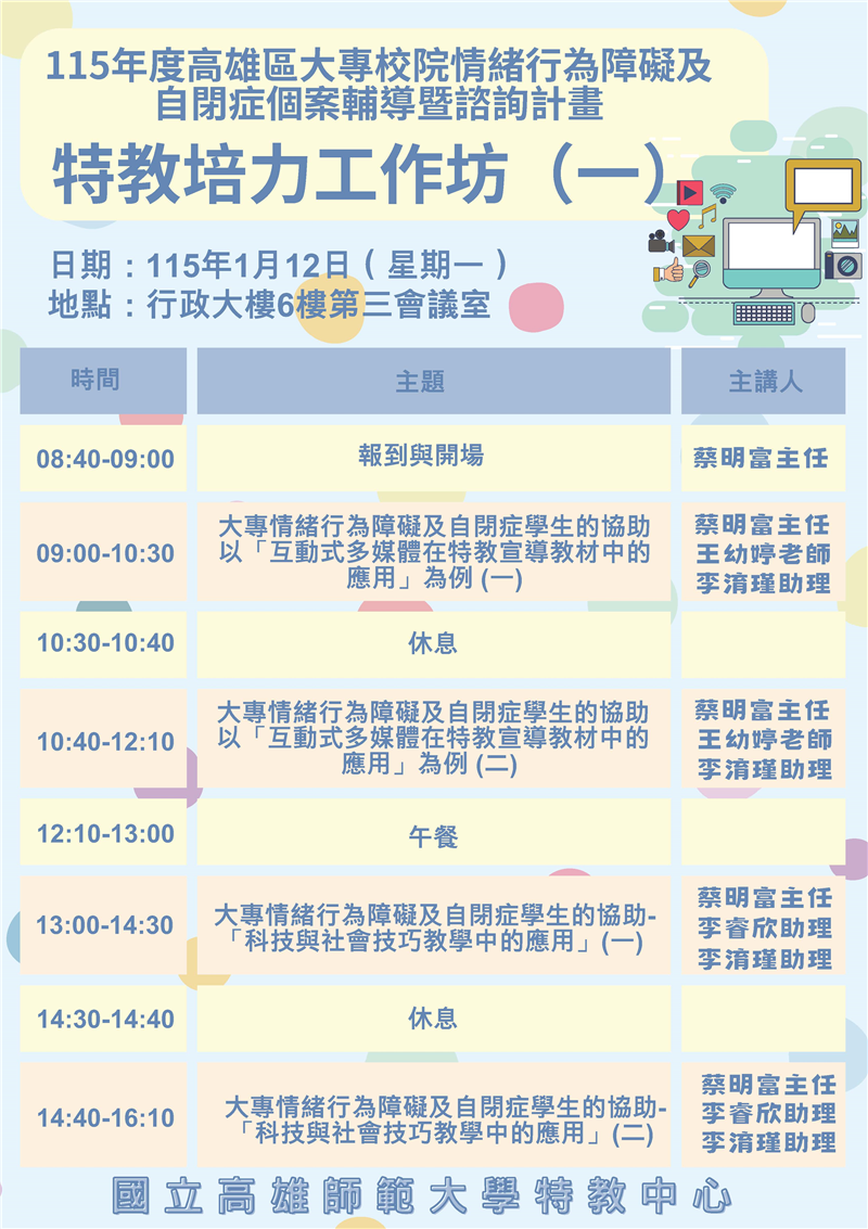- 115年1月12日辦理「特教培力工作坊(一)」研習,本中心邀請高雄師範大學特殊教育學系蔡明富教授兼特教中心主任、高雄師範大學資源教室王幼婷輔導員、高雄師範大學特殊教育中心專任計畫助理李淯瑾助理及李睿欣助理擔任講師,本研習旨在提升資源教室輔導人員特教領域專業知能與科技應用能力,並協助資源教室輔導人員了解如何引入多媒體及VR科技輔導情障及自閉症學生提高社會技巧,以及。本次研習地點在國立高雄師範大學(和平校區)行政大樓六樓第三會議室,共有25人報名參加、錄取25人、實到26人。