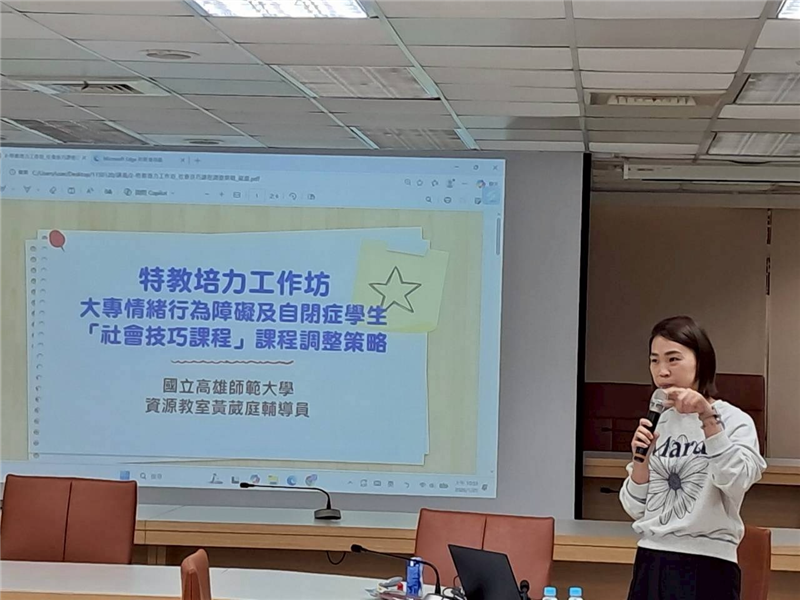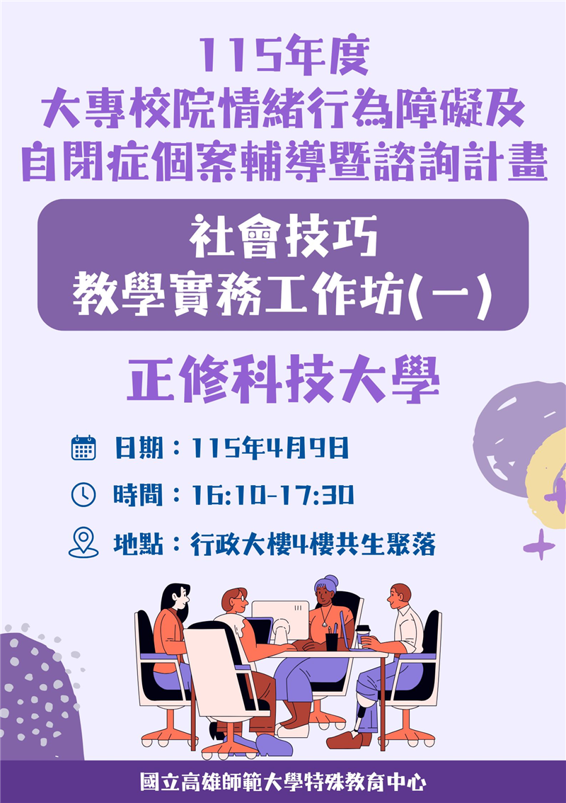 - 115年1月20日辦理「特教培力工作坊(二)」研習,本中心邀請高雄師範大學特殊教育學系蔡明富教授兼特教中心主任、高雄師範大學資源教室林寶鈺輔導員、黃葳庭輔導員、正修科技大學特殊教育資源中心彭志文輔導員擔任講師。本工作坊旨在提升資源教室輔導員對情緒行為障礙與自閉症學生社會技巧課程教學的專業知能,並協助其在資源教室引入相關課程,並有效引導學生順利融入校園生活及適應未來職場環境。