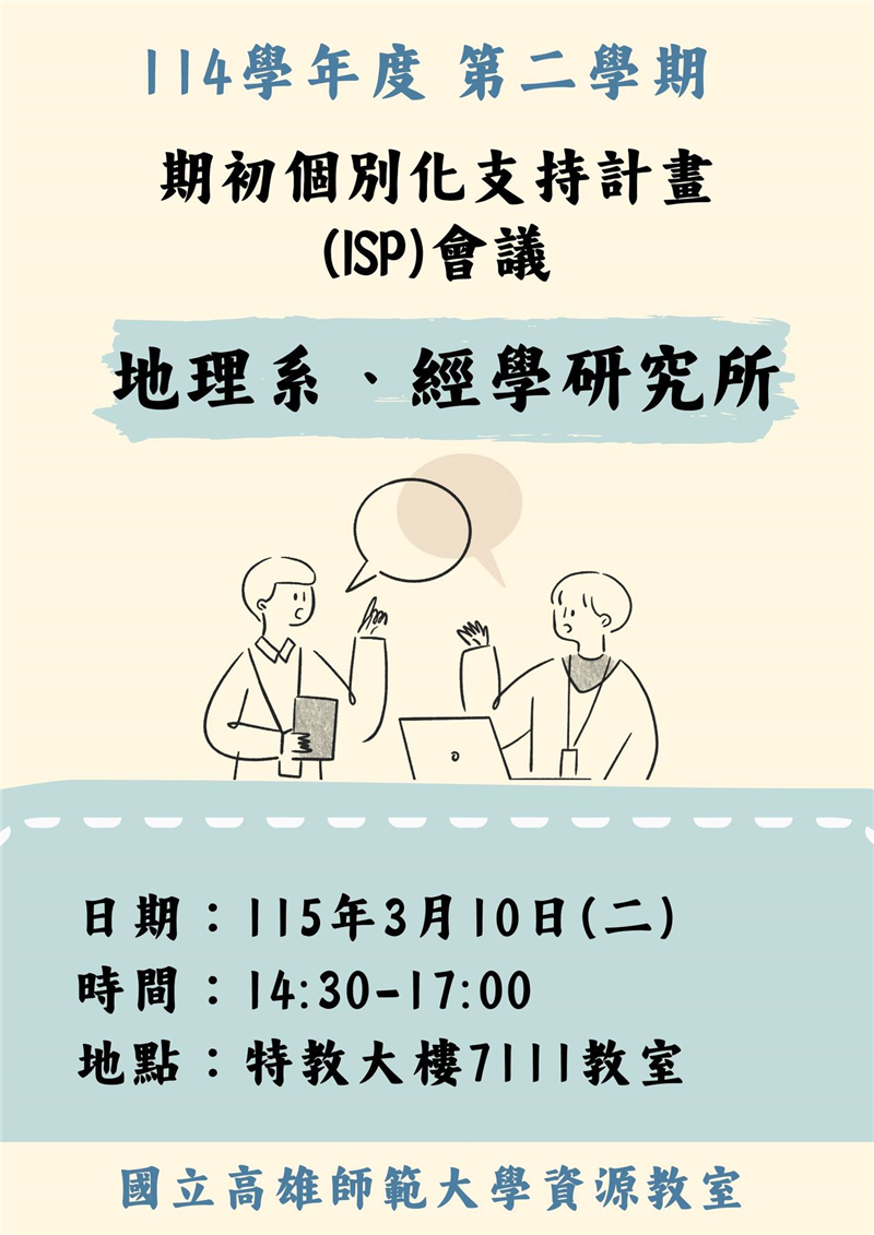 本學期召開地理系三場、經學所一場特教需求學生期初ISP會議,邀請系主任、指導教授、學生及家長共同與會,討論未來的支持與協助。