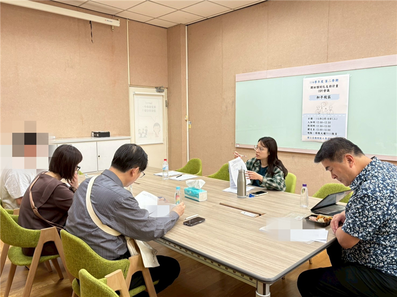 資源教室於和平校區舉行六場次個別化支持計畫會議,參與系所包含美術系、國文系、特教系、物理系,由特教中心蔡明富主任主持,邀請系主任、導師、資源教室輔導員、學生及家長共同出席。