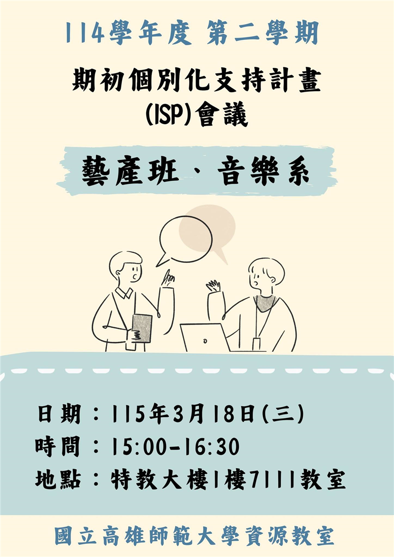 本學期召開人知、性別、國文、藝產、音樂等共8場期初ISP會議,由特教中心蔡明富主任主持,邀請各系所師長及家長共同參與,討論學生這學期的支持服務與需求。