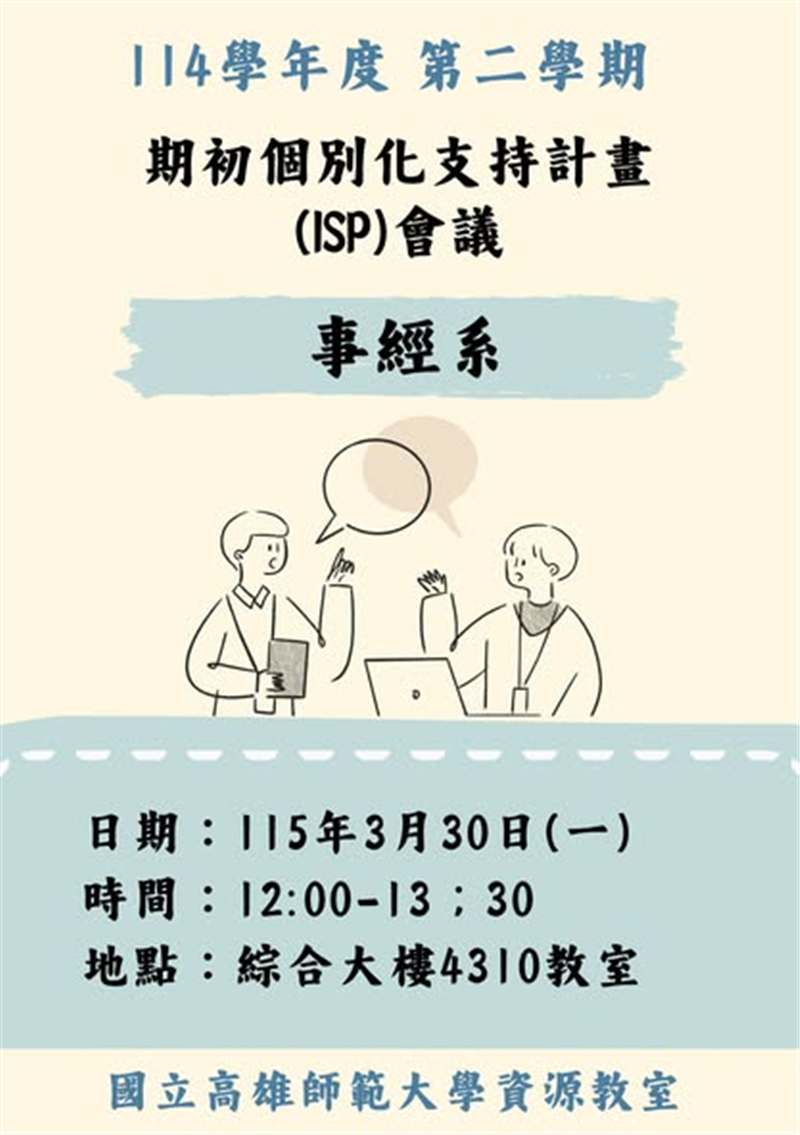 資源教室辦理三場次事經系期初ISP會議,邀集系主任、導師、學生及家長等相關人員共同參與,針對學生本學期之學習與適應情形進行整體性討論與支持規劃。會議中著重關心學生之學習適應狀況,包含出席穩定度、課堂參與情形及可能影響學習之相關因素,並由師長提供專業觀察與具體建議,以協助釐清學生當前面臨之困難與需求。