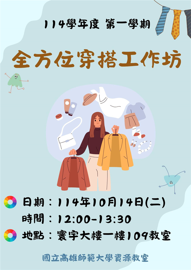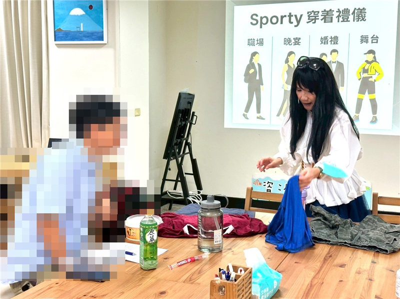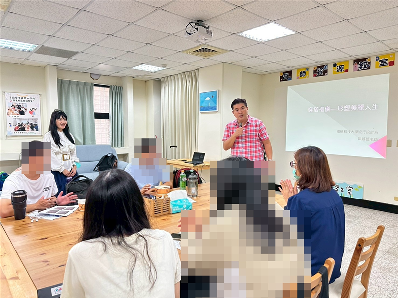 為協助學生培養服裝搭配的概念及技巧,資源教室安排全方位穿搭工作坊,特邀樹德科技大學流行設計系洪慕藍老師擔任講師。課程內容以認識適合自己的衣服風格為主軸,透過講解四季色彩理論,讓學生了解春、夏、秋、冬四種色調的特色與應用,進而延伸至日常穿搭技巧與職場正式衣著搭配重點。