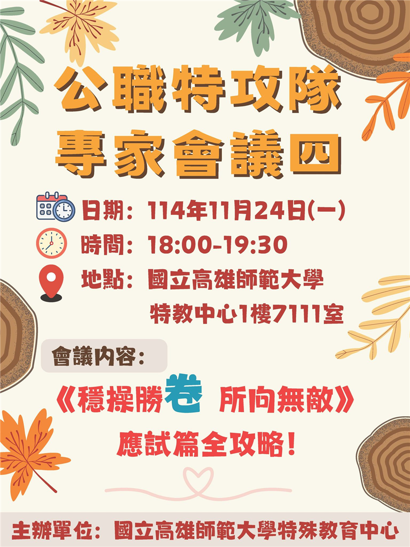 💡亦可至公職特攻隊網頁看更多公職考試相關訊息:https://ksped.nknu.edu.tw/Page.aspx?PN=56......