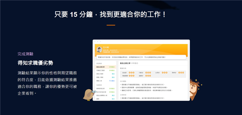 🍀測驗特色:測驗結果顯示你的性格與期望職務的符合度,且能依據測驗結果推薦適合你的職務,讓你的優勢更可被企業看到。