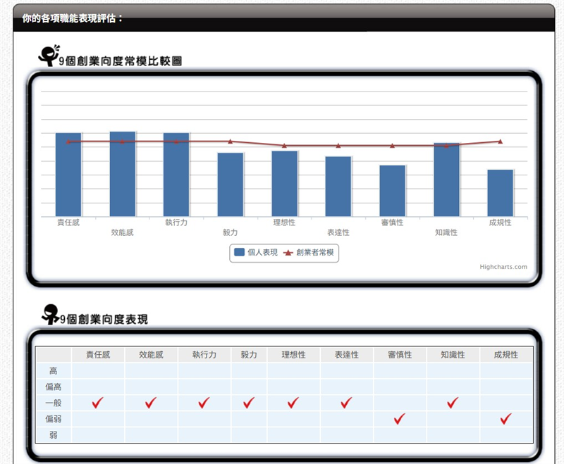 💫施測方法:跟著畫面指引,完成63題李克特量表,即可獲得各項職能表現評估報告,包含9個創業向度常模比較圖、創業向度表現,及各產業類別創業適合度分析。