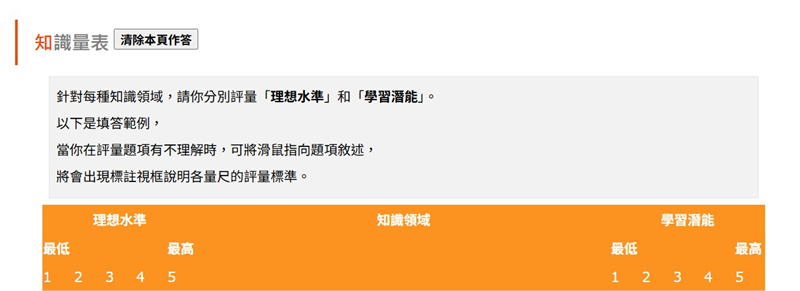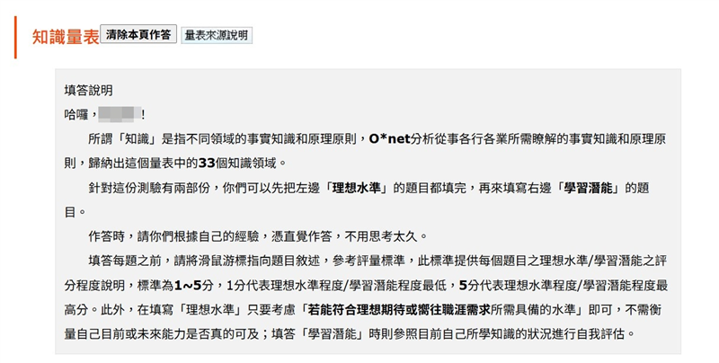⭐施測方法:跟著題目指導語進行作答,填寫「理想水準」只要考慮「若能符理想期待或嚮往職涯需求所需具備的水準」即可,不須衡量自己目前或未來能力是否真的可及;填答「學習潛能」時則參照目前自己所學知識的狀況進行自我評估,完成33題量表,即可獲得知識量表結果分析報告。