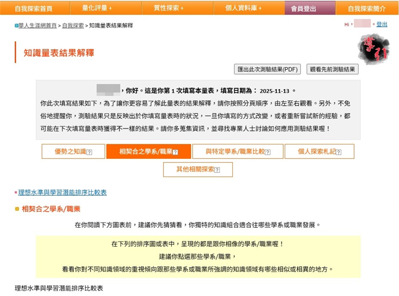 ⭐測驗目的:所謂知識是指不同領域的事實或原理原則,協助受試者自我評估理想期待或嚮往職涯所需具備的知識,及目前自己所學知識之水準,了解相契合的學系及職業,同時也能掌握個人的知識優勢類型。