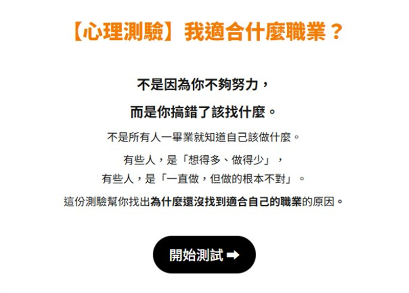 💡測驗目的:職業興趣測驗可以幫助你有效率的向內探索,找出自己潛藏的優勢及職業方向。