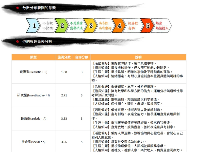 🍀施測方法:跟著題目指導語進行作答,完成48題興趣量表及6題分量表,即可獲得職業興趣評估報告,包含六項何倫碼分數分布、前三大興趣類型。