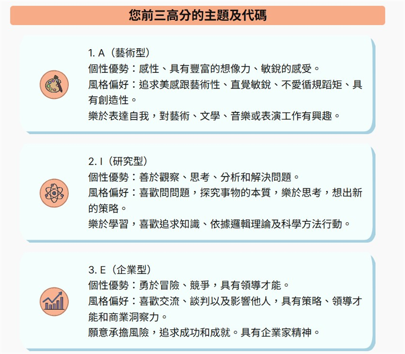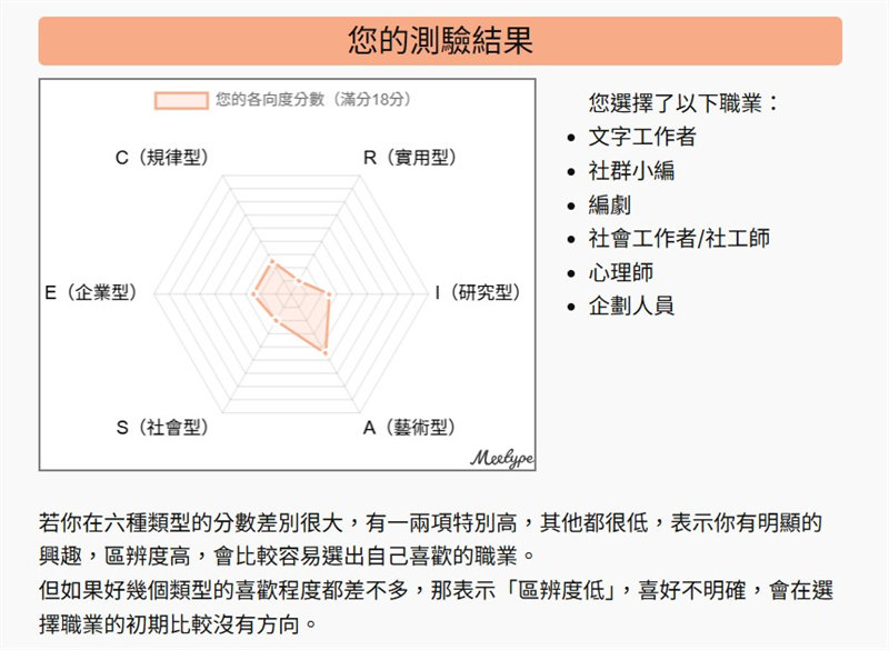 🔗測驗網址:https://meetype.com/holland-code-career-test