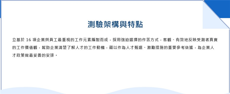 本量表由 104測評中心依據企業與員工普遍重視的 16項工作元素所編製,並採用強迫選擇作答方式,能較客觀地呈現受測者真實的工作價值觀。