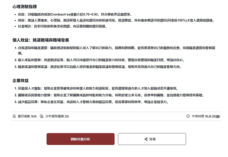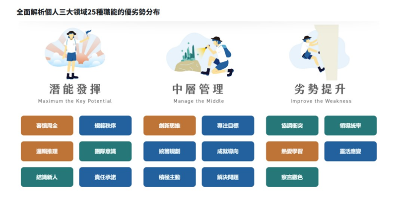 💡施測題目: 共105題,全面解析個人三大領域25種職能的優劣勢分布